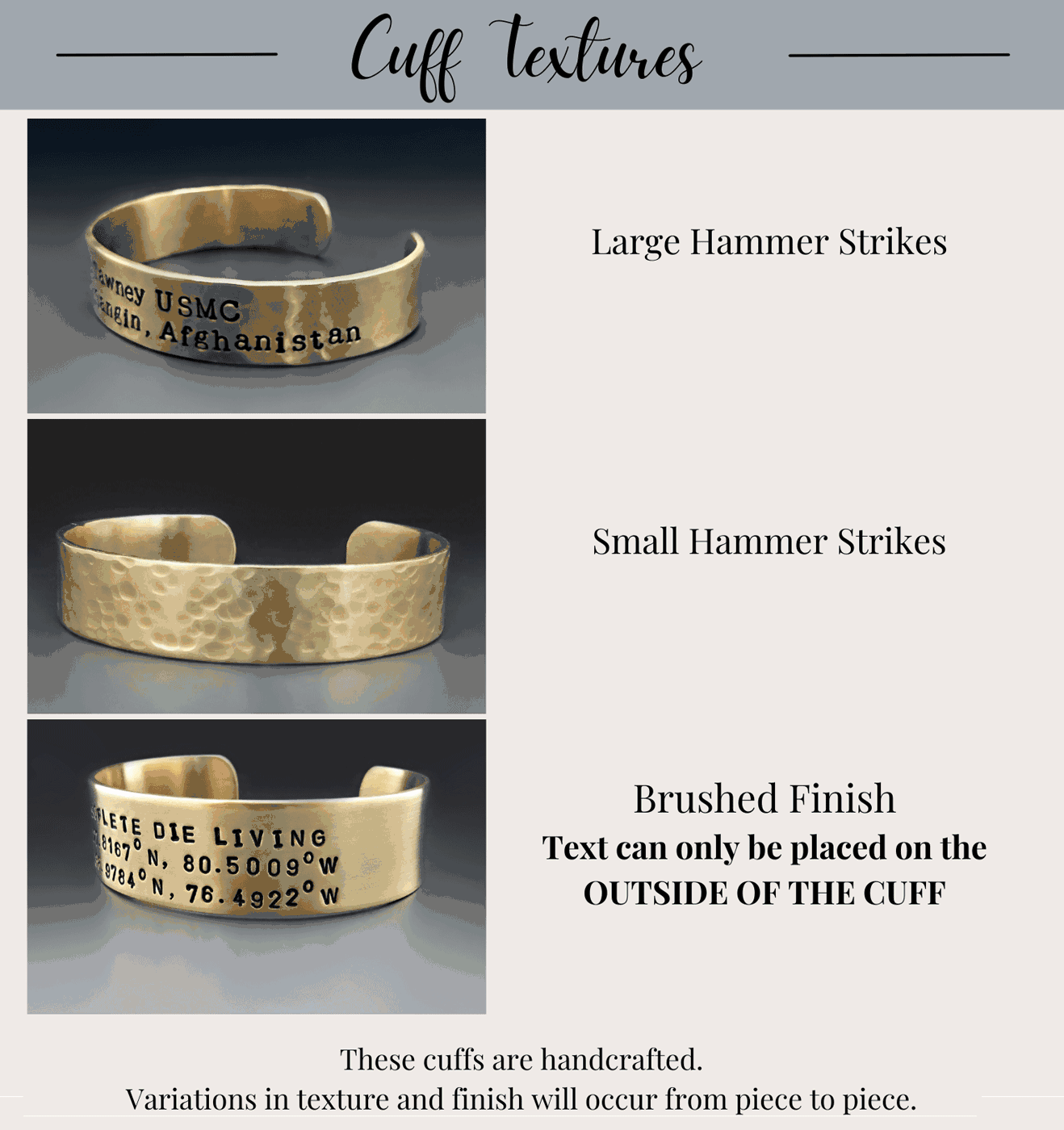 Variations in spacing and letter/number alignment may occur. These differences should not been seen as defects, but rather adding to the charm and uniqueness of each piece. These cuffs are handmade and not made with a machine, so no two items will ever look exactly alike.