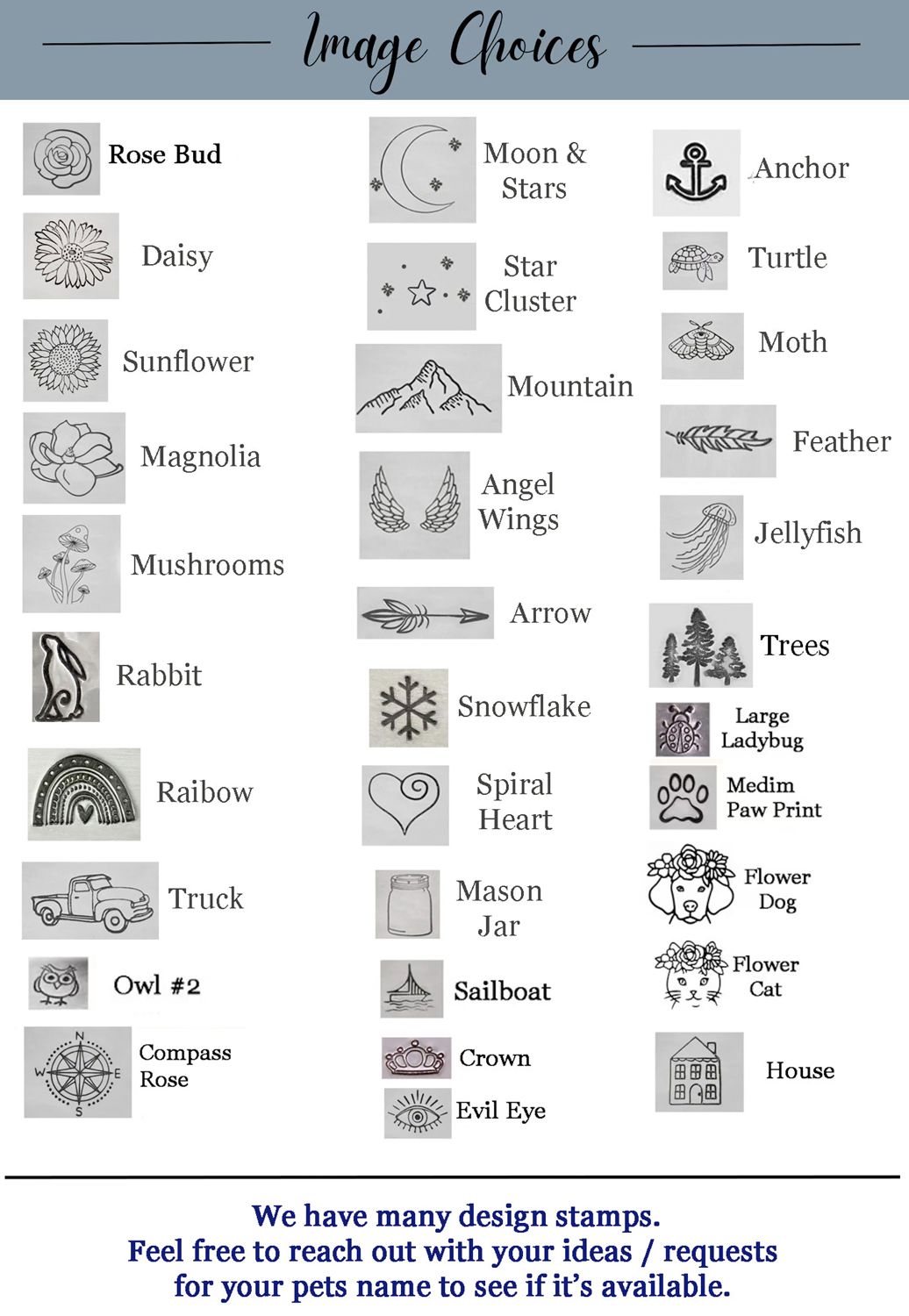 These cuffs are handmade. They will NOT have the precision of machine engraving. I cannot create custom images or use fonts other than the ones shown in the product photos.