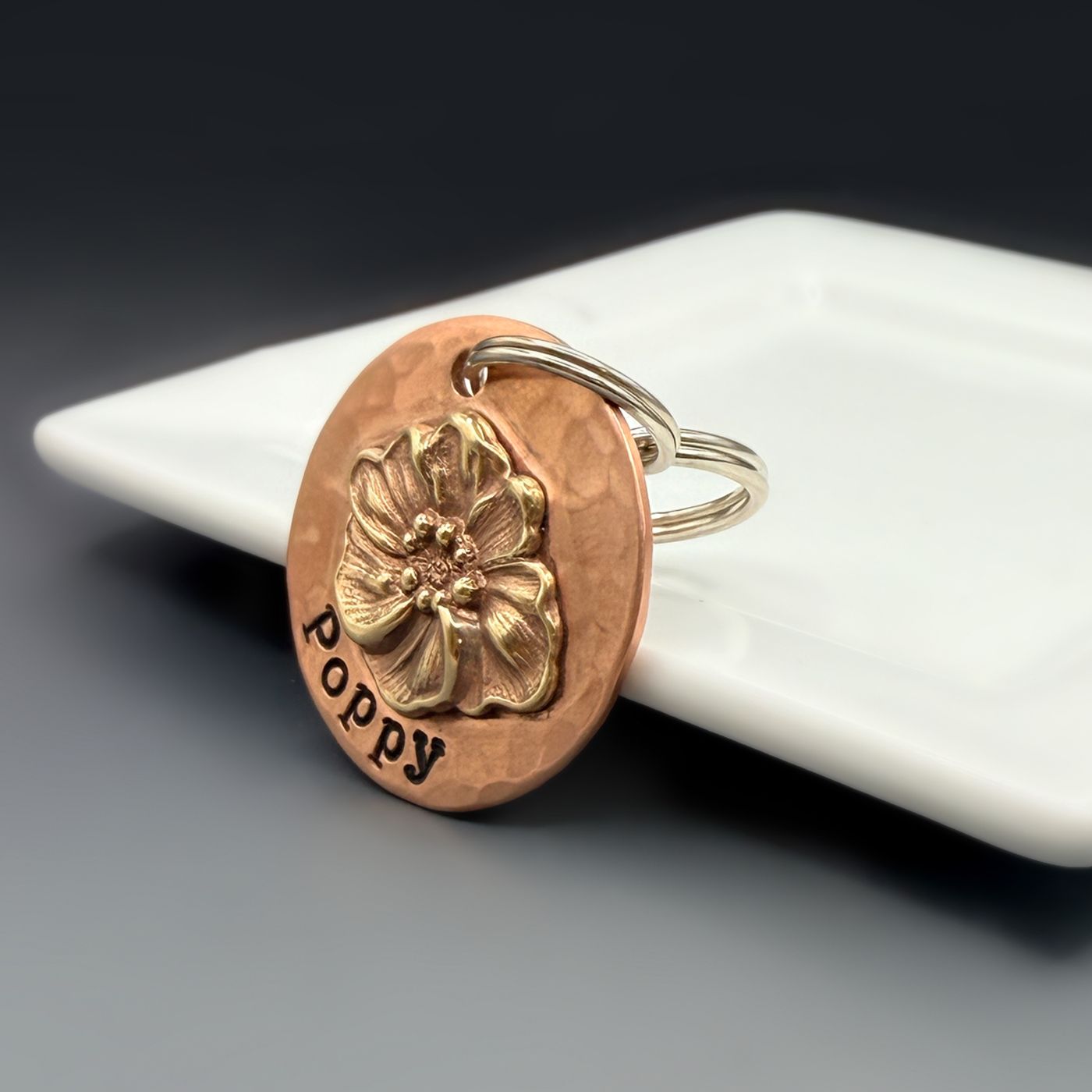 This handcrafted dog tag features a warm copper base accented with a raised brass poppy flower, creating a beautiful contrast of color and texture. Each piece is hand forged and finished by me, then individually hand stamped, making every tag one of a kind.The poppy is a symbol of remembrance, love, and resilience, making this tag especially meaningful for pets who hold a special place in your heart. The metal tag has a softly hammered texture that catches the light, while the brass flower adds dimension and character.