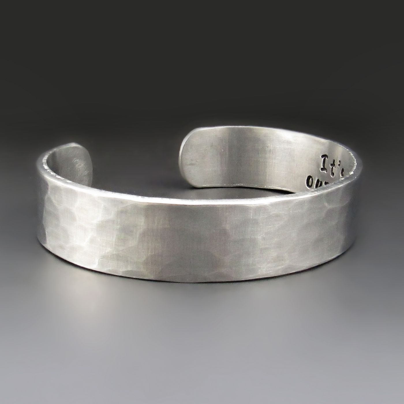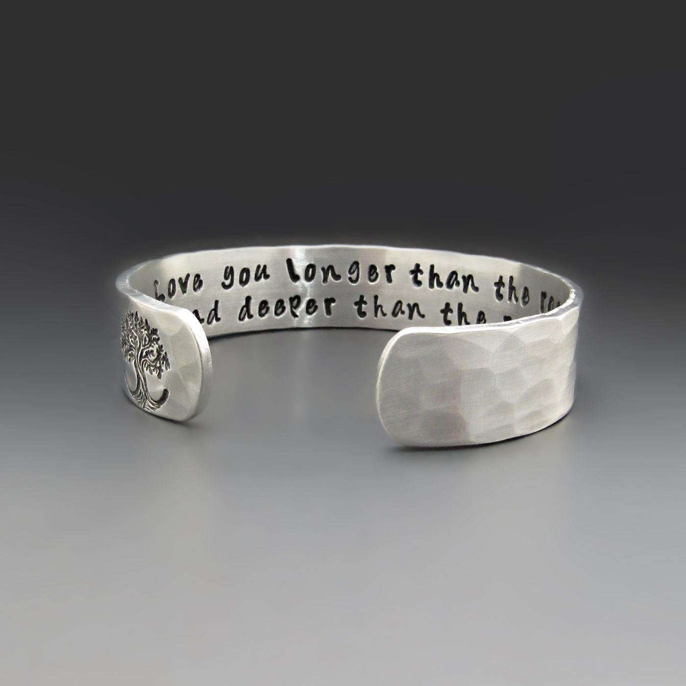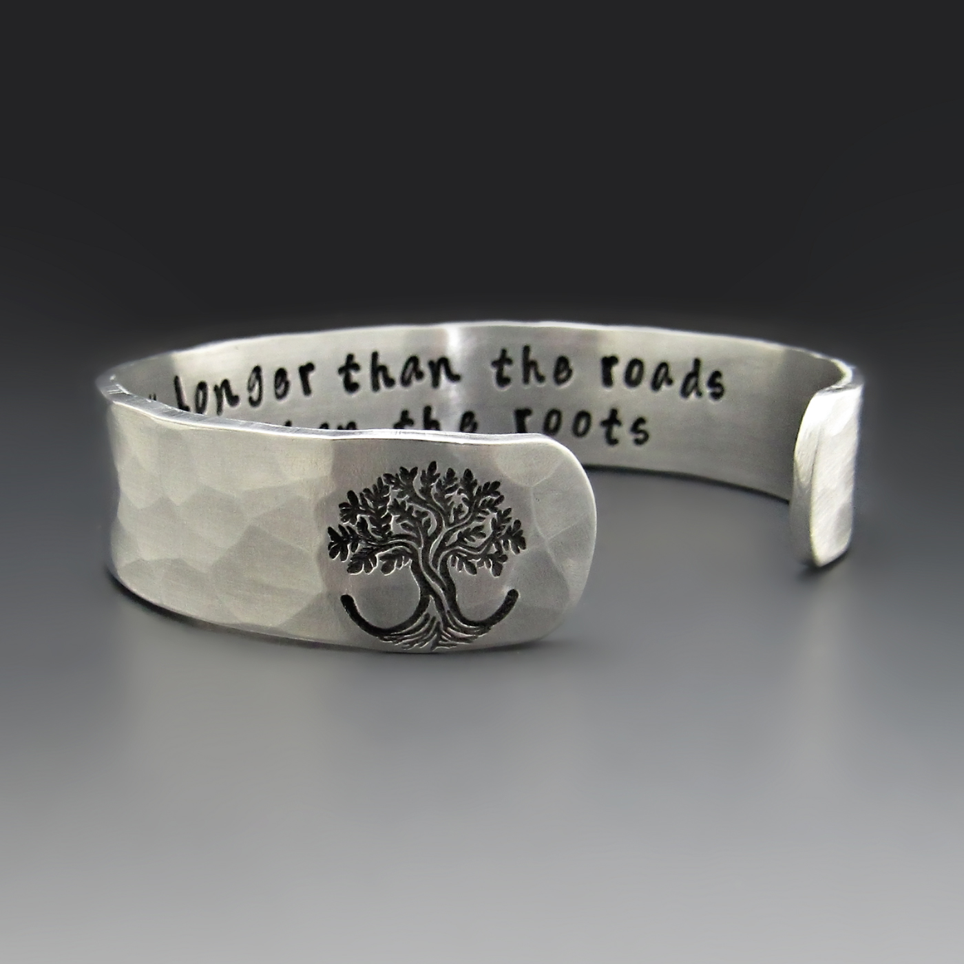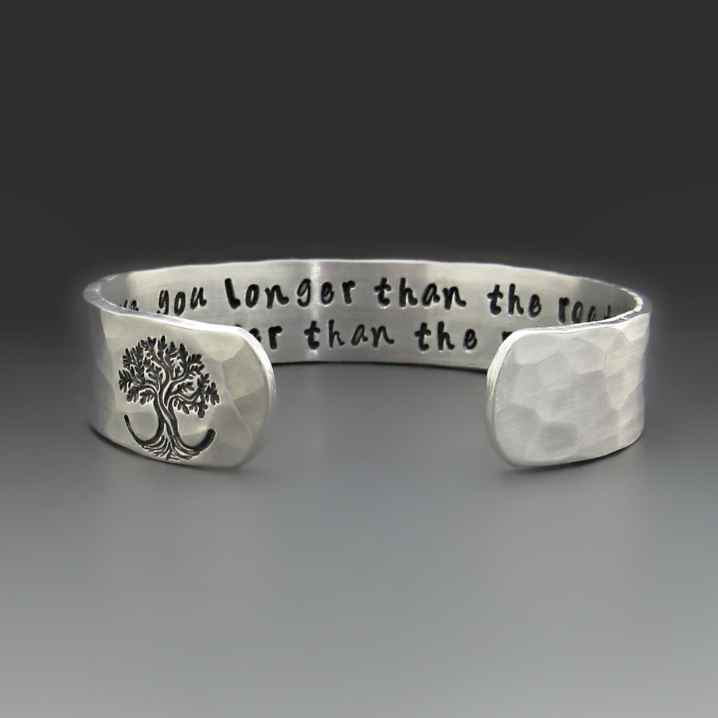 This handcrafted cuff is made from lightweight, hypoallergenic aluminum and finished with a hammered texture that gives it an organic feel.The outside edge is stamped with a Tree of Life. Its' roots serves as a powerful symbol of strength, growth, and connection. On the inside, your chosen words are stamped one letter at a time, creating a hidden message meant just for you or someone you love.