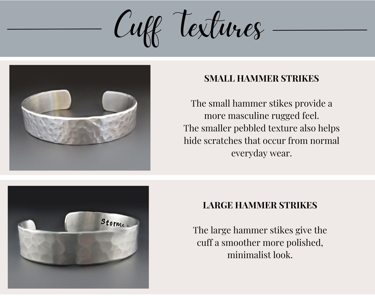 These cuffs are handmade. They will NOT have the precision of machine engraving. I cannot create custom images or use fonts other than the ones shown in the product photos.