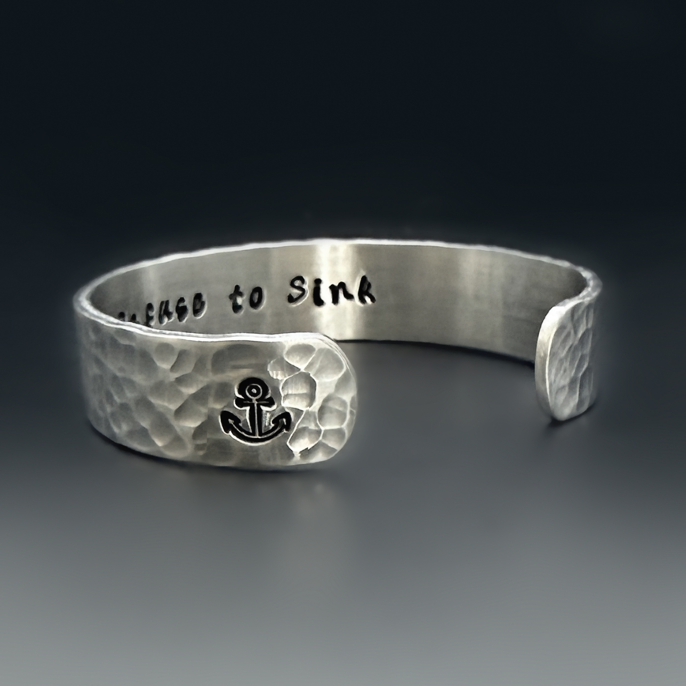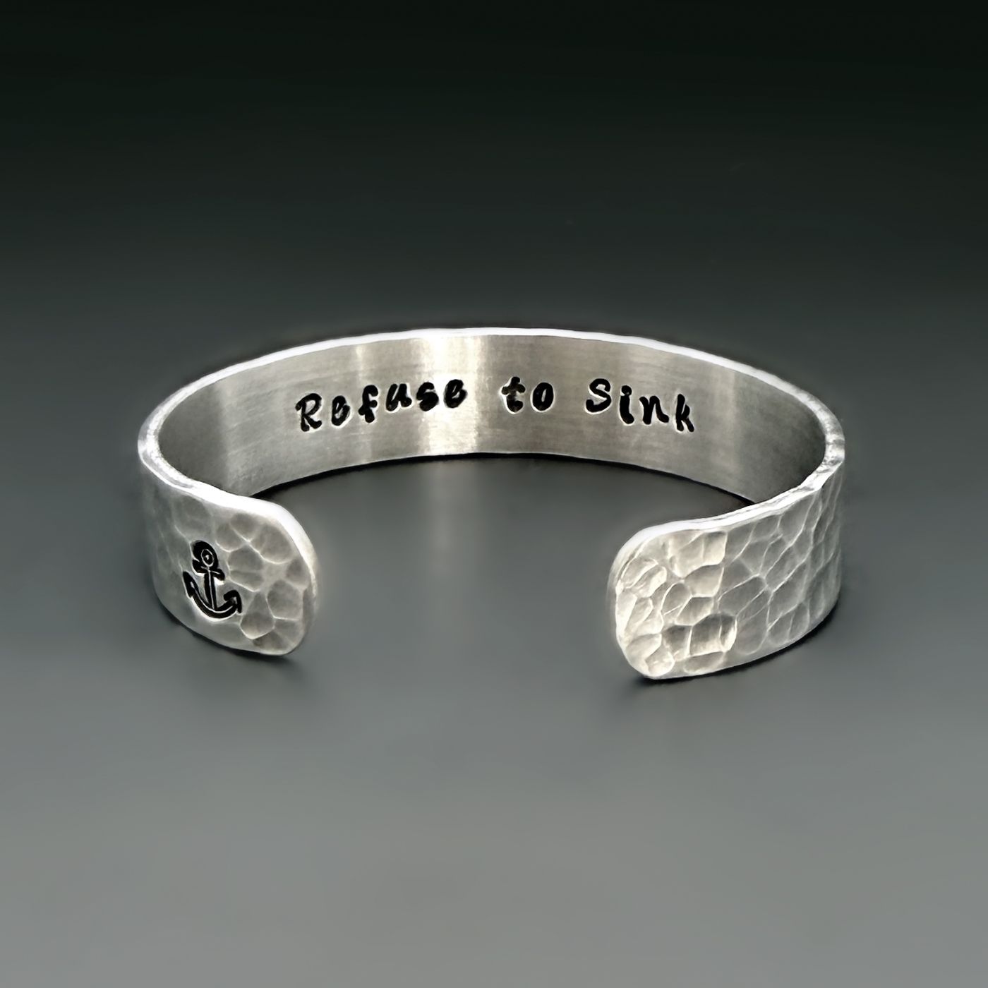 No matter how rough the sea of life becomes I will never give up! Be brave, stay strong and refuse to sink.This silver inspirational cuff bracelet is hand stamped with "Refuse to Sink". An Anchor image is etched on the outside edge as a visual reminder of your power.
