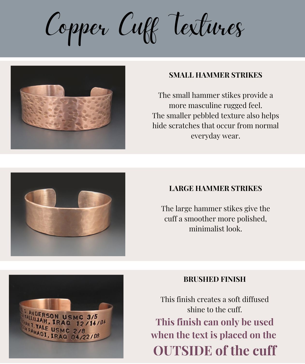 These cuffs are handmade. They will NOT have the precision of machine engraving. I cannot create custom images or use fonts other than the ones shown in the product photos.