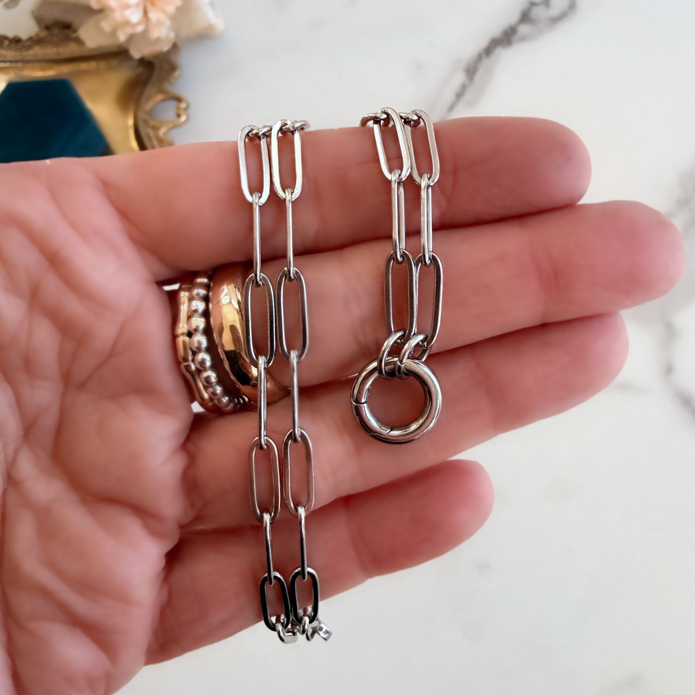 A modern classic with endless charm appeal, this Paperclip Chain Necklace with Round Charm Clasp blends clean, contemporary design with everyday versatility.Inspired by the timeless paperclip chain trend, known for its elongated, architectural links that elevate both casual and dressed-up looks, this necklace makes the perfect base for personalization.