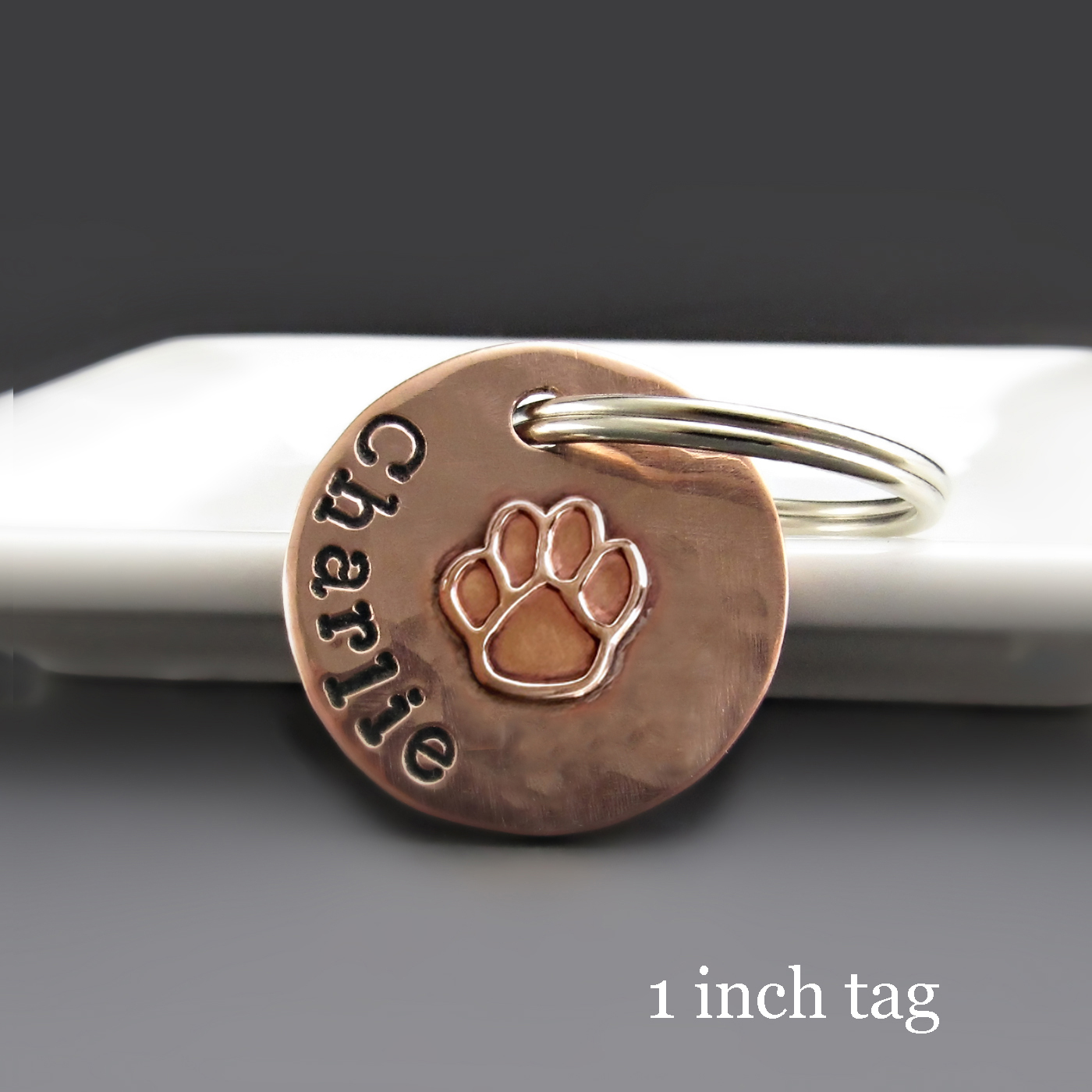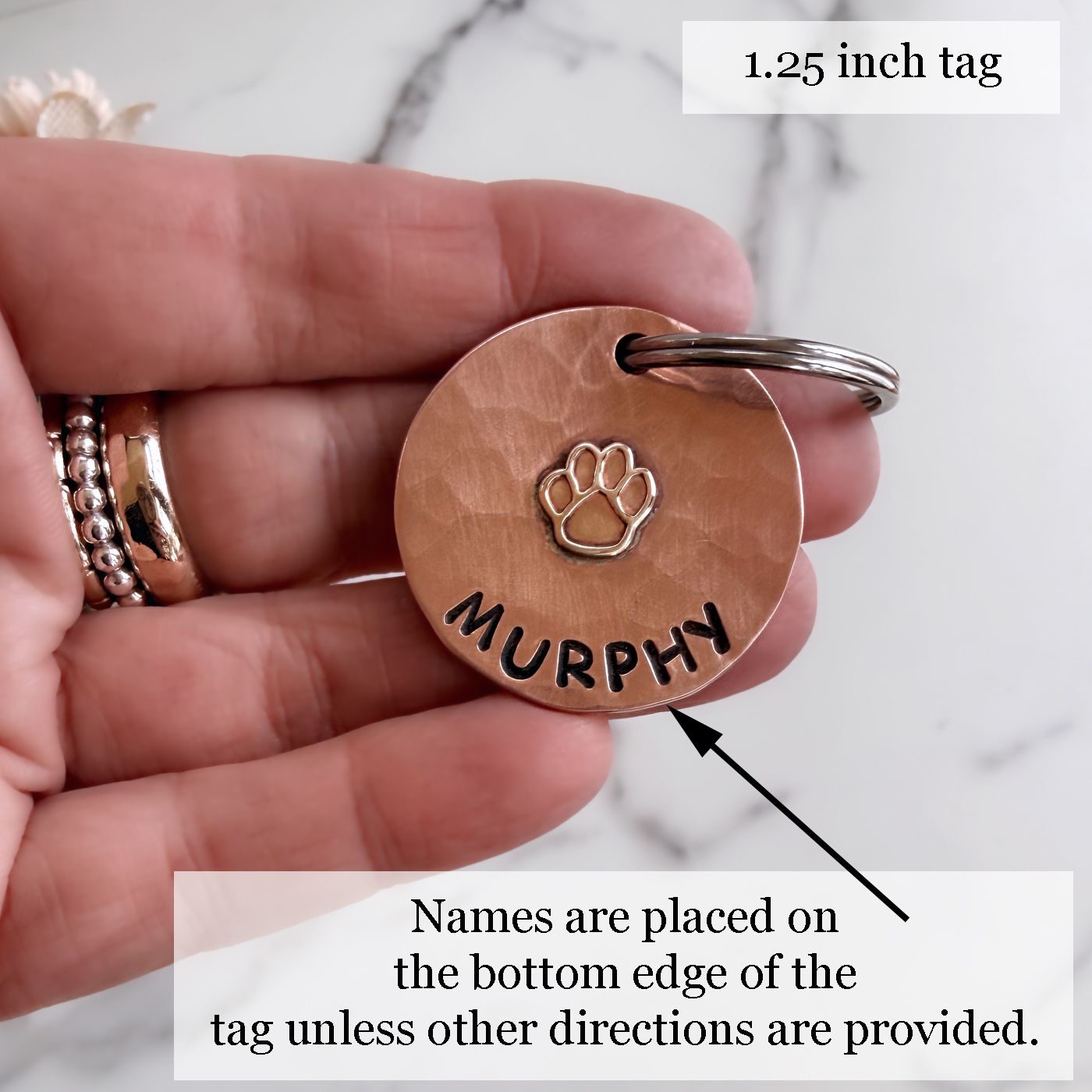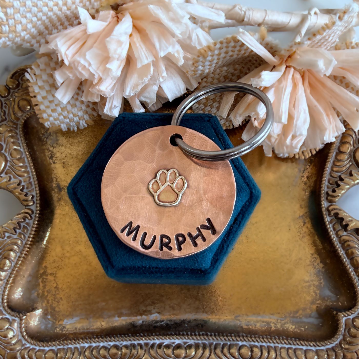 Celebrate your four-legged best friend with a tag that is as unique as they are. This handcrafted pet tag features a warm copper base paired with a raised brass paw print, creating a beautiful two-tone design that stands out while remaining timeless and durable.Each tag is individually hand-stamped with your pet's name, making every piece one-of-a-kind. The lettering is darkened for contrast so it is easy to read, while the solid metal construction holds up to everyday adventures, from backyard play to long walks.
