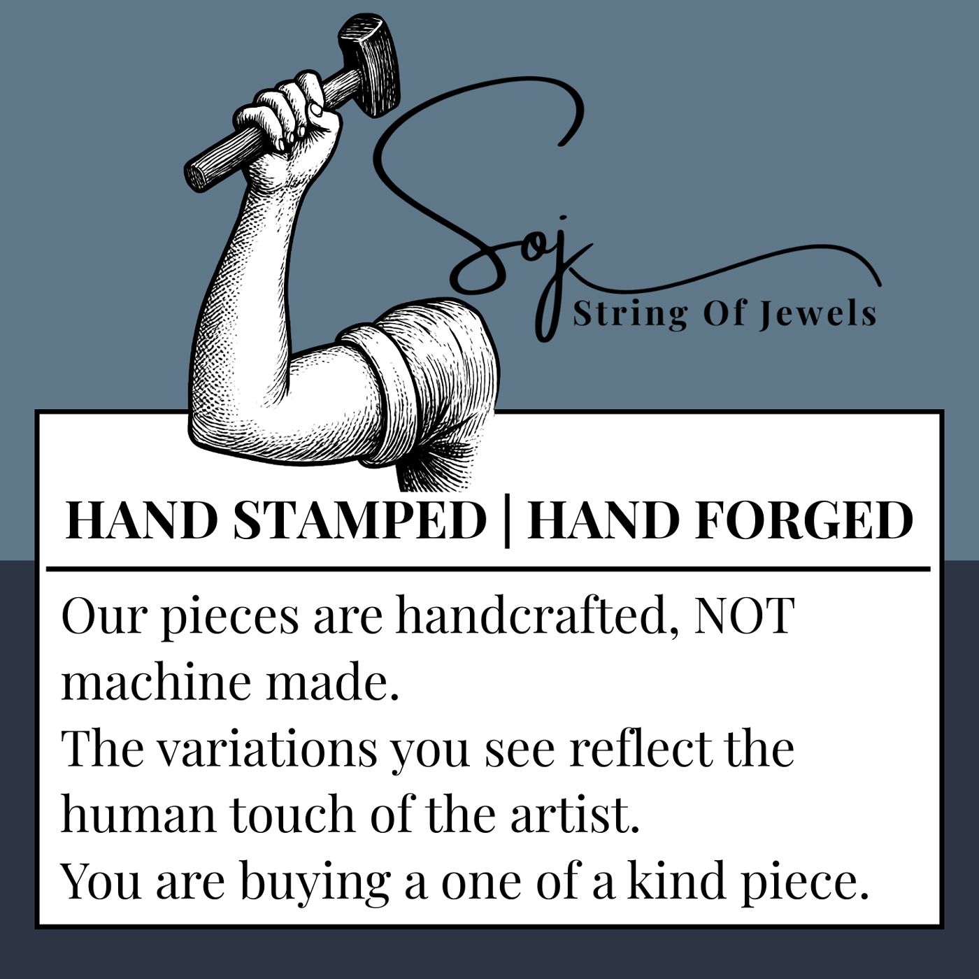 I personally hand-stamp my pieces. Hand Stamping is different from a machine engraving process. Each letter, number and symbol is created using individual stamping tools that are hammered into the metal.