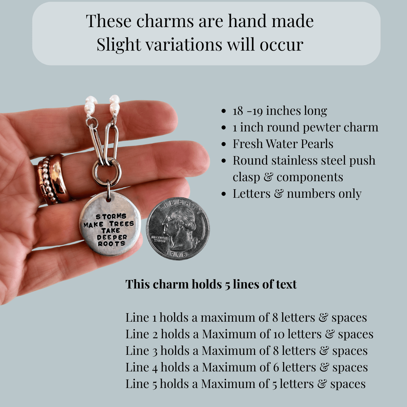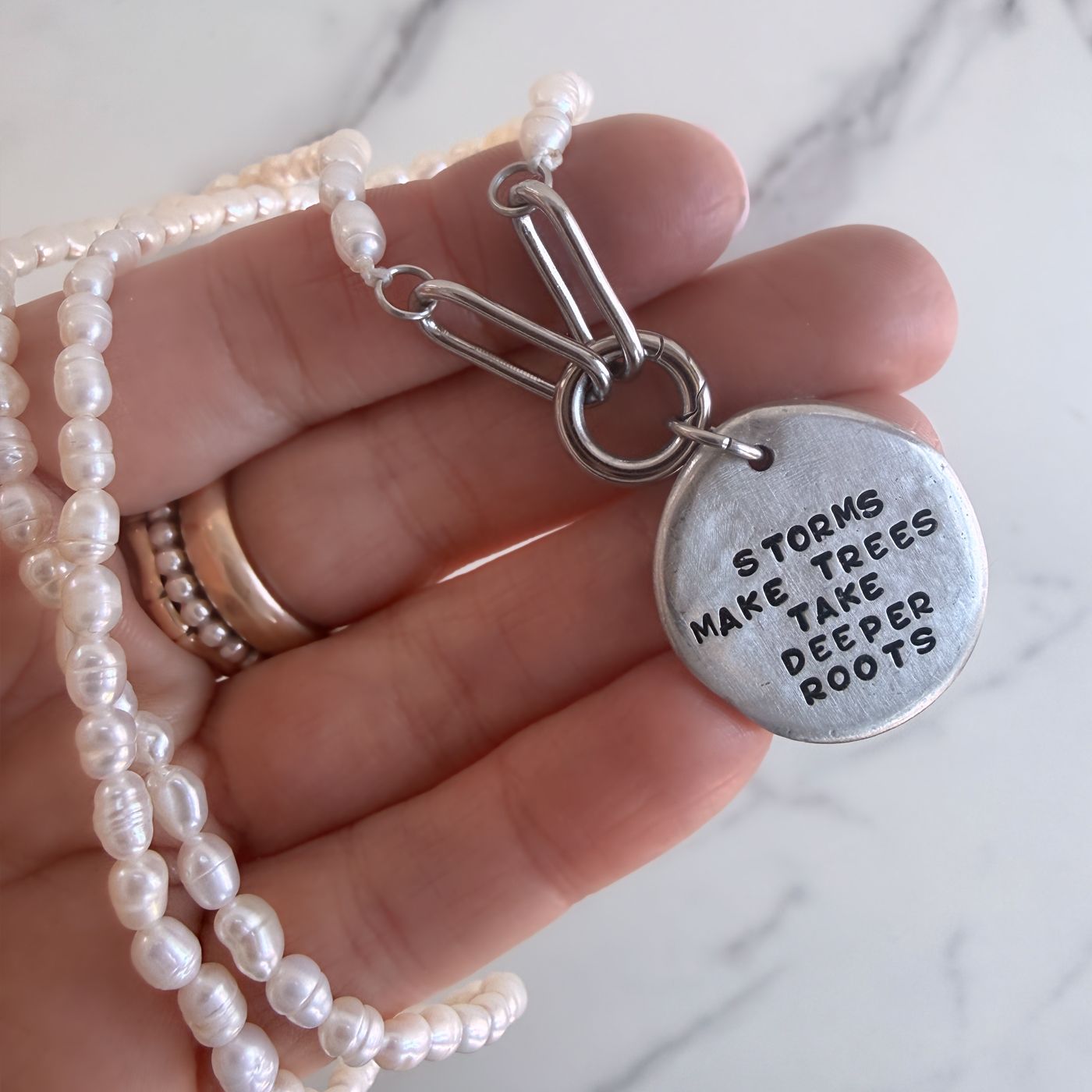 Add names, dates or a meaningful quote. This inspirational pearl necklace is perfect for marking milestones, offering encouragement, or giving a thoughtful, symbolic gift to someone navigating change, healing, or new beginnings.