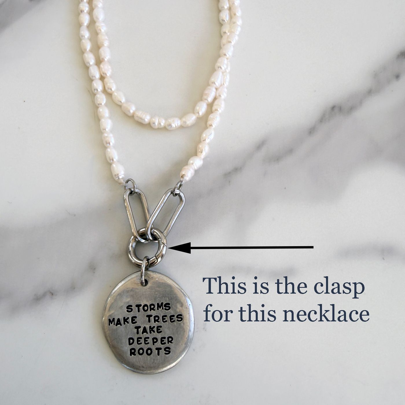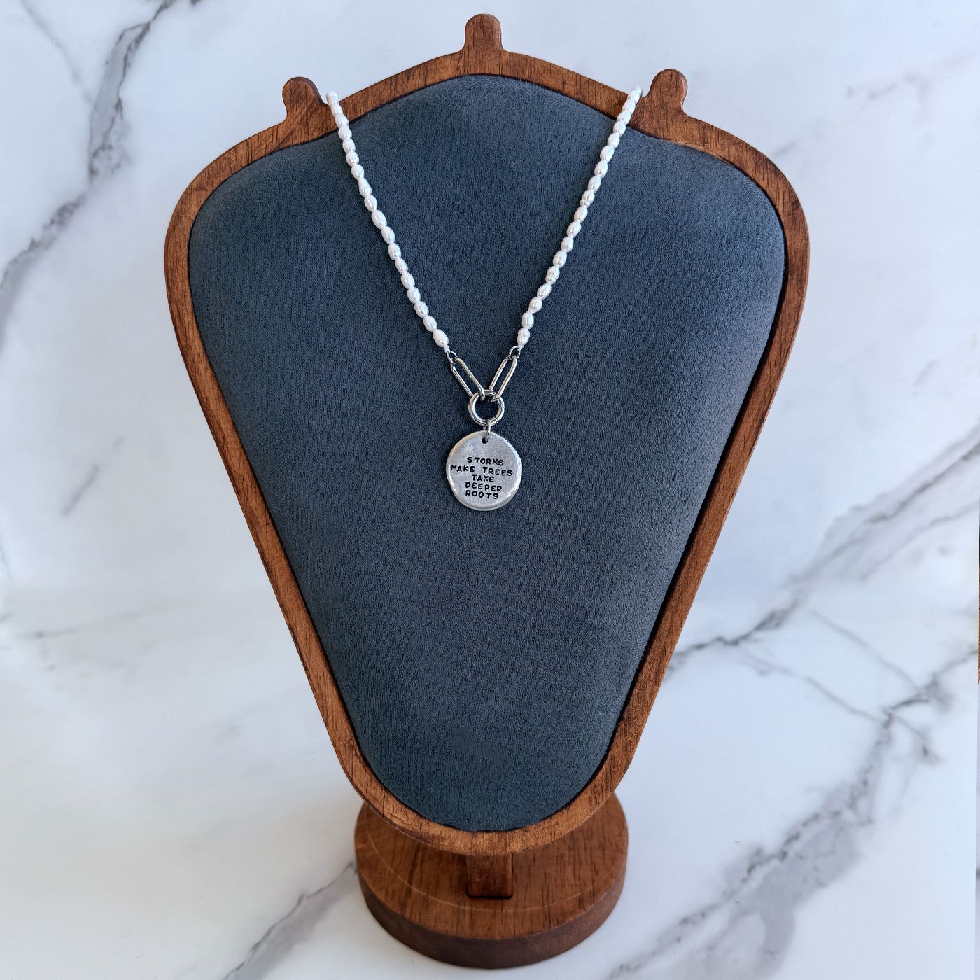 This freshwater pearl necklace features an organic pewter pebble pendant, hand-stamped one letter at a time with an inspiring message that celebrates resilience, strength, and personal growth.Each necklace is made with white freshwater pearls, chosen for their soft, natural glow and timeless beauty. At the center hangs a pewter pebble pendant, organically shaped and hand-stamped, creating subtle variations that make every piece truly one of a kind. No two pearls or pendants are exactly alike, just like the stories they represent.