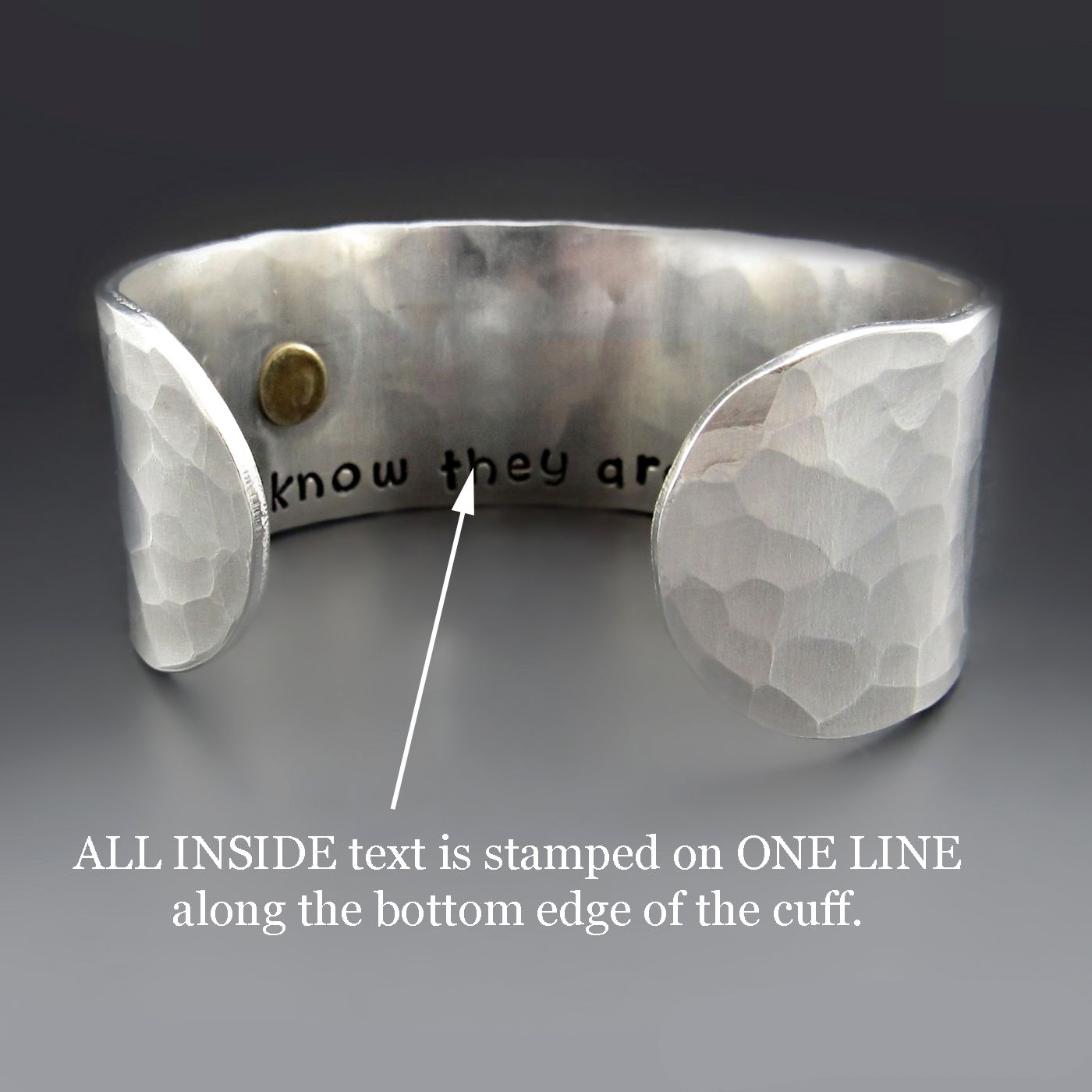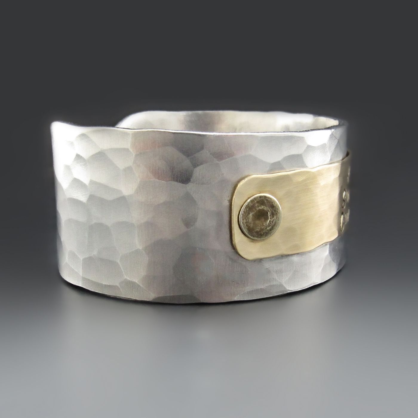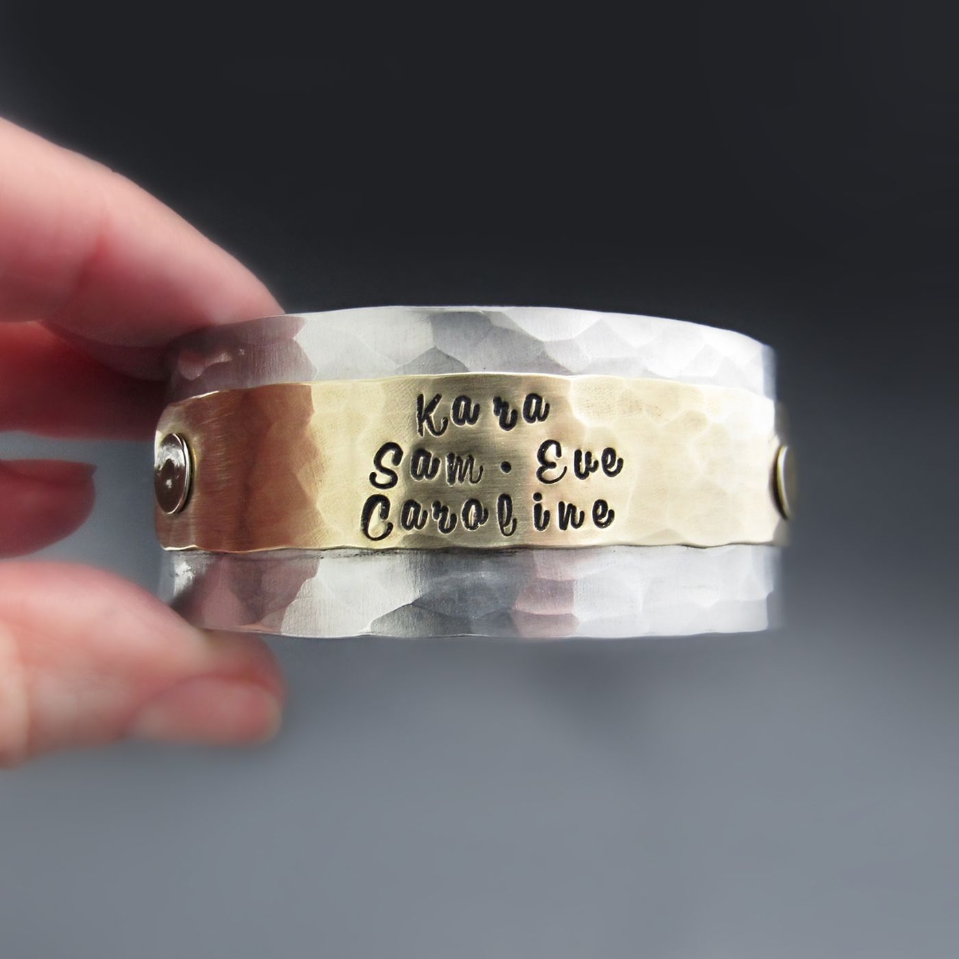 Custom mixed metal cuff bracelet hand stamped with names, dates or meaningful words. Hammered silver aluminum and brass design. A timeless personalized gift for moms, anniversaries, and everyday wear.This piece is a true testament to the fusion of elegance and individuality. Crafted with precision and passion, this one-of-a-kind piece combines the warmth of gold with the cool allure of silver.