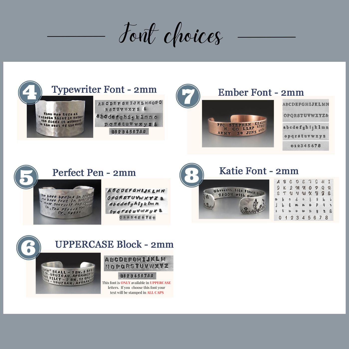 These cuffs are handmade. They will NOT have the precision of machine engraving. I cannot create custom images or use fonts other than the ones shown in the product photos.