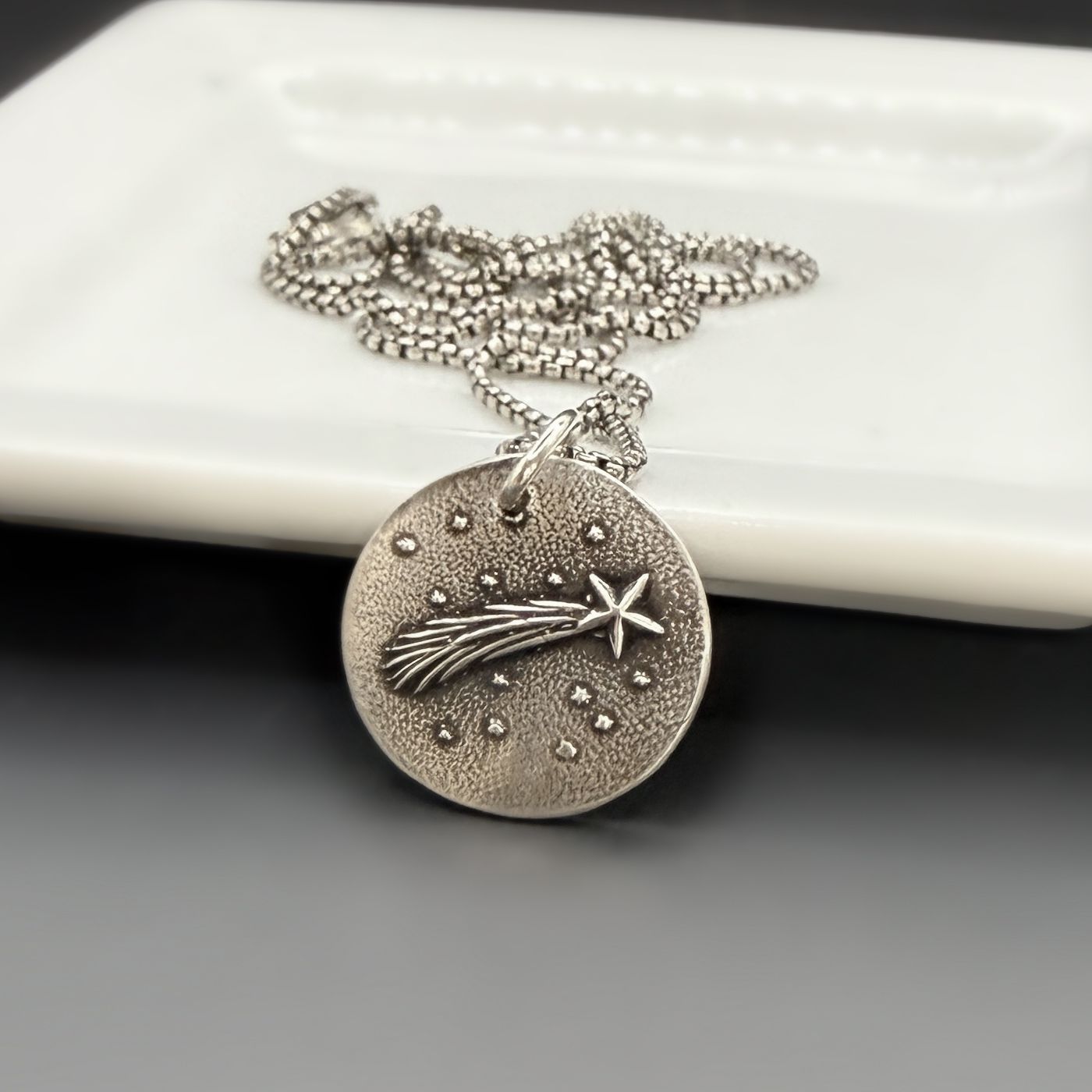 Shoot for the moon, even if you miss you'll land among the stars.Wear this sterling silver shooting star pendant close to your heart. A simple silhouette of a falling star is ready to carry your hopes, dreams, and wishes wherever you go. Whether you are celebrating a milestone or marking a fresh start, this necklace becomes a keepsake for the moments that matter.