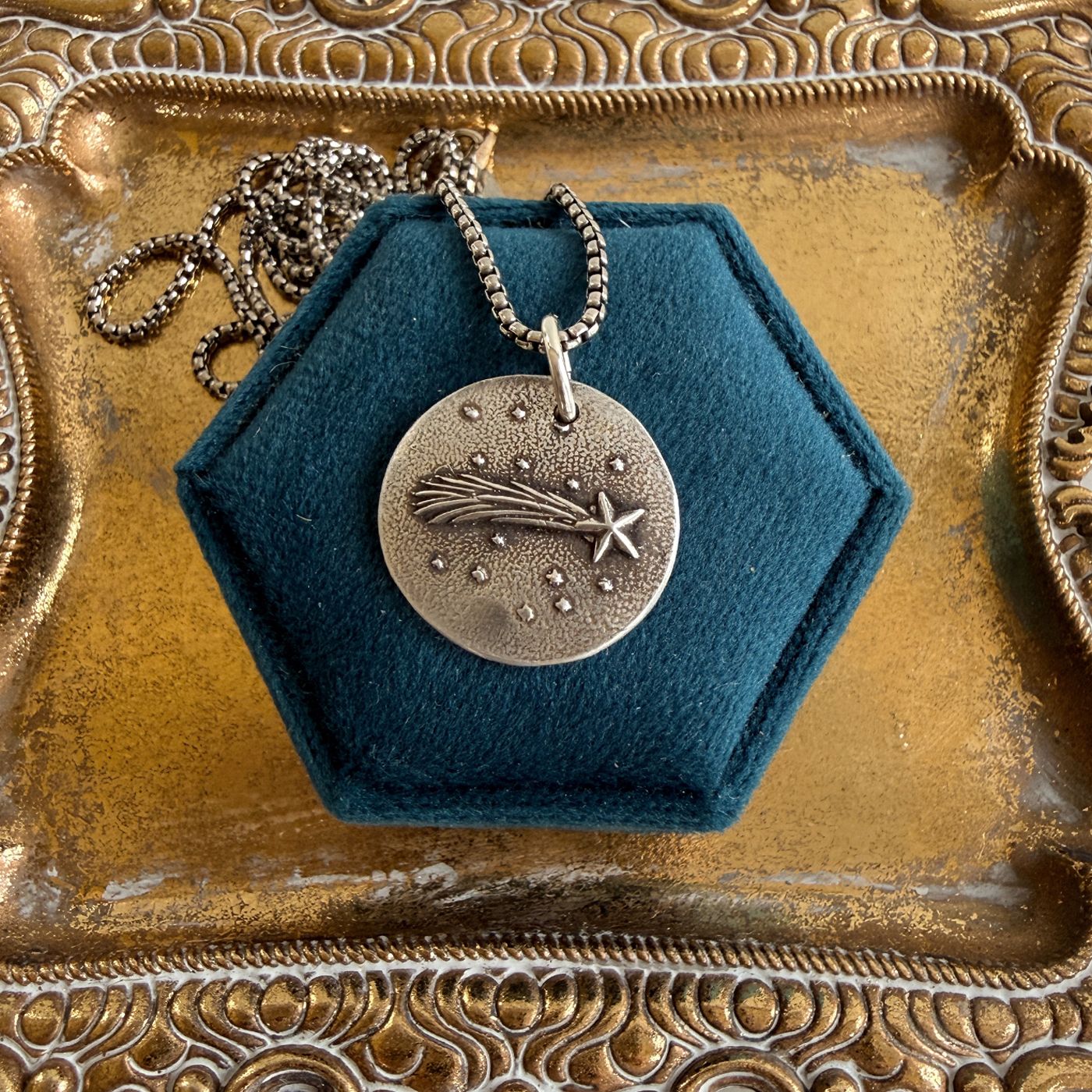 Each pendant is hand cast and fired in a kiln in my studio. It is washed with a light patina and tumble polished to give it dimension. Slight variations will occur from pendant to pendant. These differences should not been seen as defects, but rather adding to the charm and uniqueness of each piece. The hand cast process makes each charm as one of a kind as the person who wears it.