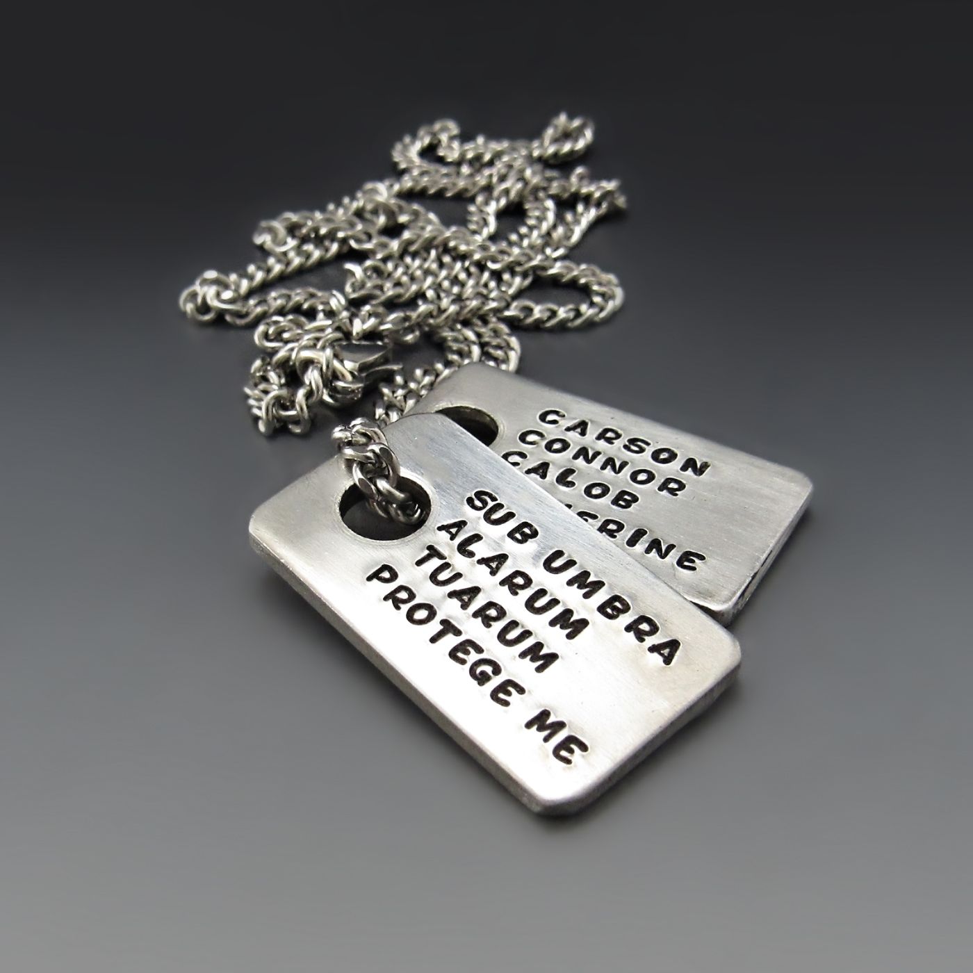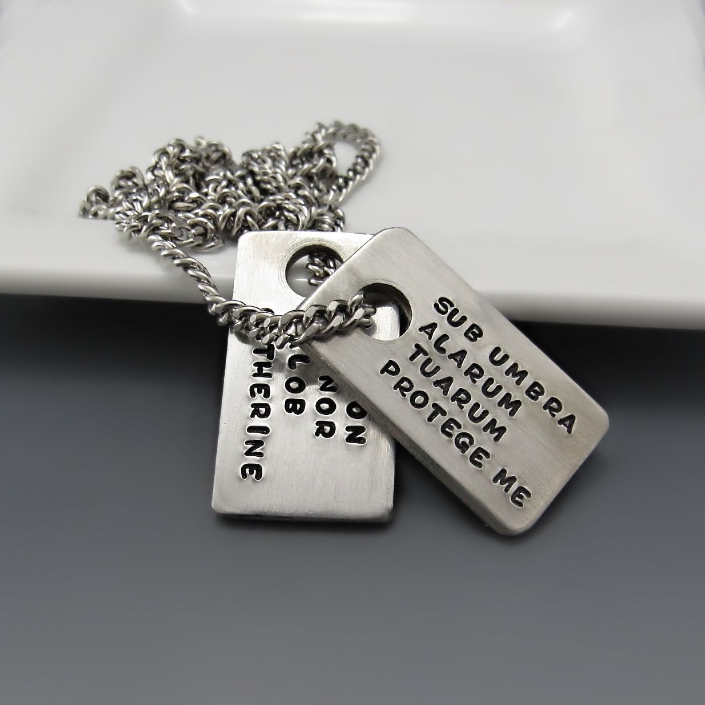 Carry protection, strength, and meaning close to your heart. These hand-stamped dog tag pendants. Each tag is individually hammered with metal stamps, creating an artisan piece filled with intention rather than machine perfection.These pewter tags are brushed and have a substantial weight that feels grounding without being heavy. The wide rectangular shape allows for clean text while maintaining a modern, minimal aesthetic.
