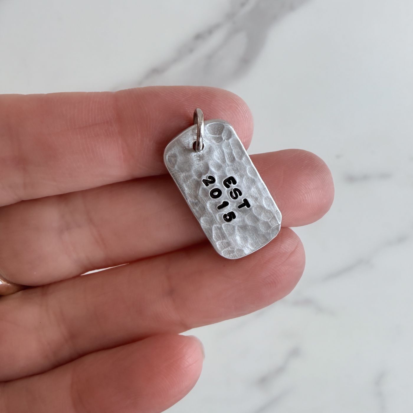 This personalized pewter charm is a small piece with big meaning. Handcrafted and individually hand-stamped, each charm carries your chosen name, date, or short message, making it a truly personal keepsake.Made from heavy gauge pewter, this charm has a hammered finish.