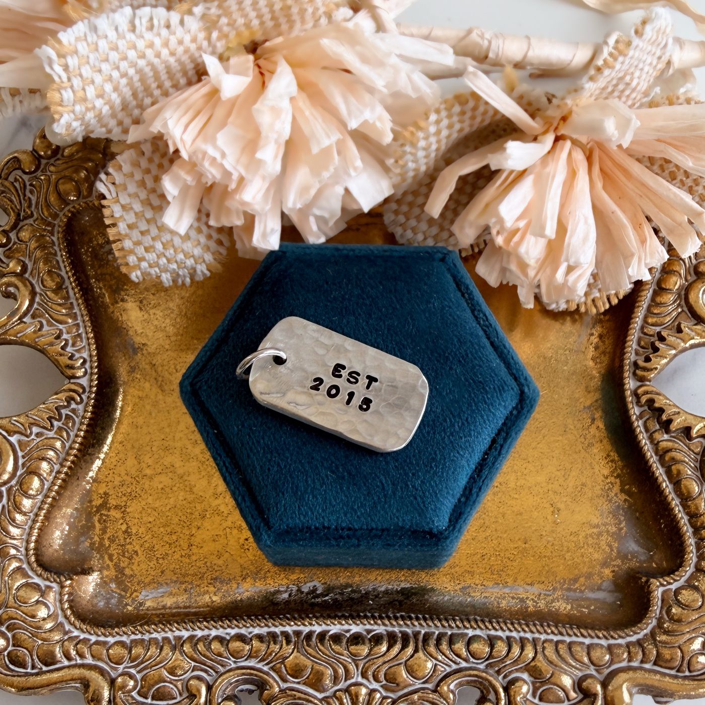 I personally hand-stamp my pieces. Hand Stamping is different from a machine engraving process. Each letter, number and symbol is created using individual stamping tools that are hammered into the metal.