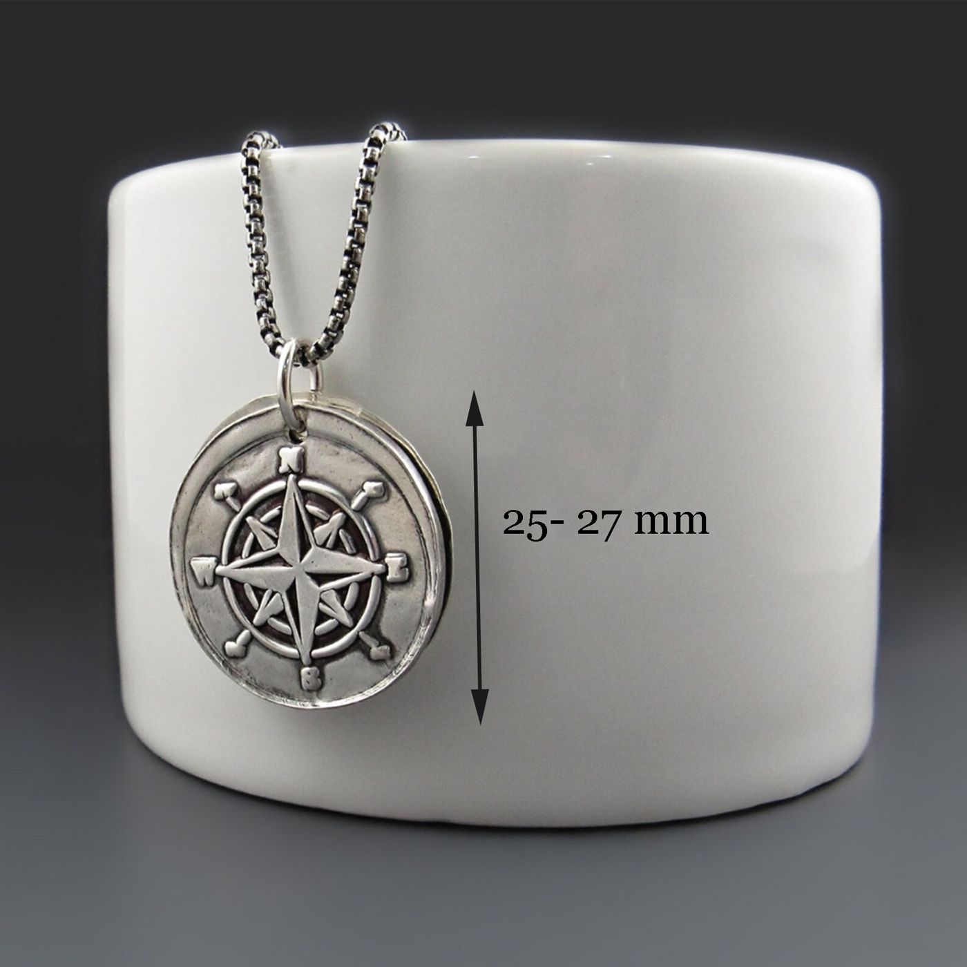Wander where you must . Wear this compass necklace as a reminder that you already possess the strength, intelligence and bravery to navigate your way through unknown perils to find your way in the world.The compass pendant is hand cast from sterling silver and layered with a sterling silver hand stamped disk that reads "No all who wander are lost".