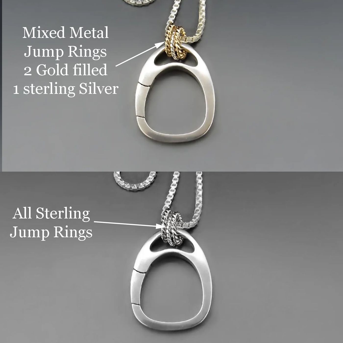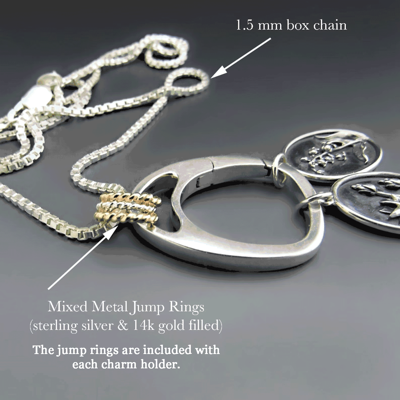 Effortlessly elegant and beautifully functional, this Sterling Silver Teardrop Charm Holder Necklace is designed to keep your favorite charms close to your heart. The sleek, organic teardrop shape adds a modern twist to classic jewelry design, while the hinged opening allows you to easily add or remove charms whenever inspiration strikes.Crafted in solid sterling silver, this piece is accented with a trio of twisted gold-filled & sterling silver jump rings that bring a subtle pop of texture. The pendant hangs gracefully from a sturdy sterling silver box chain, creating a refined yet versatile look that transitions seamlessly from day to night.