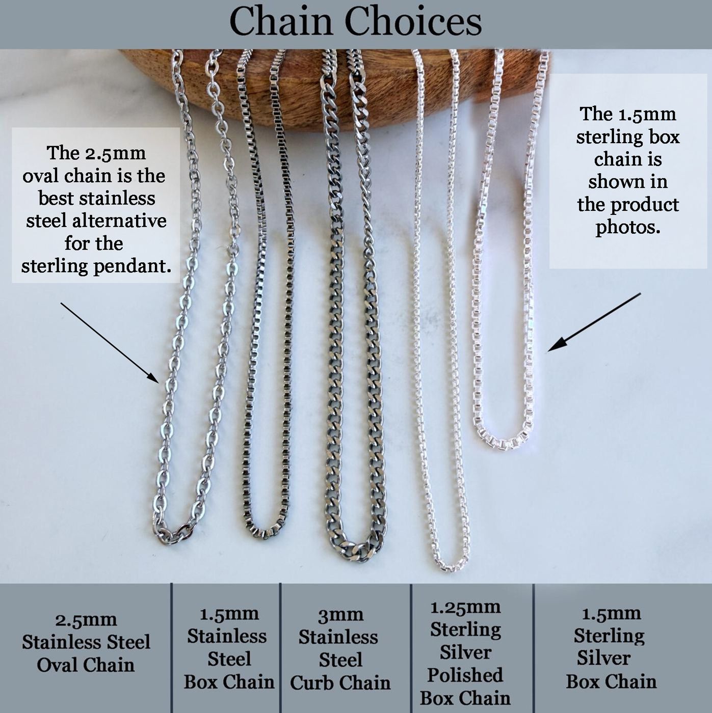 Shown with the 1.5mm Sterling silver box chain with lobster clasp closure