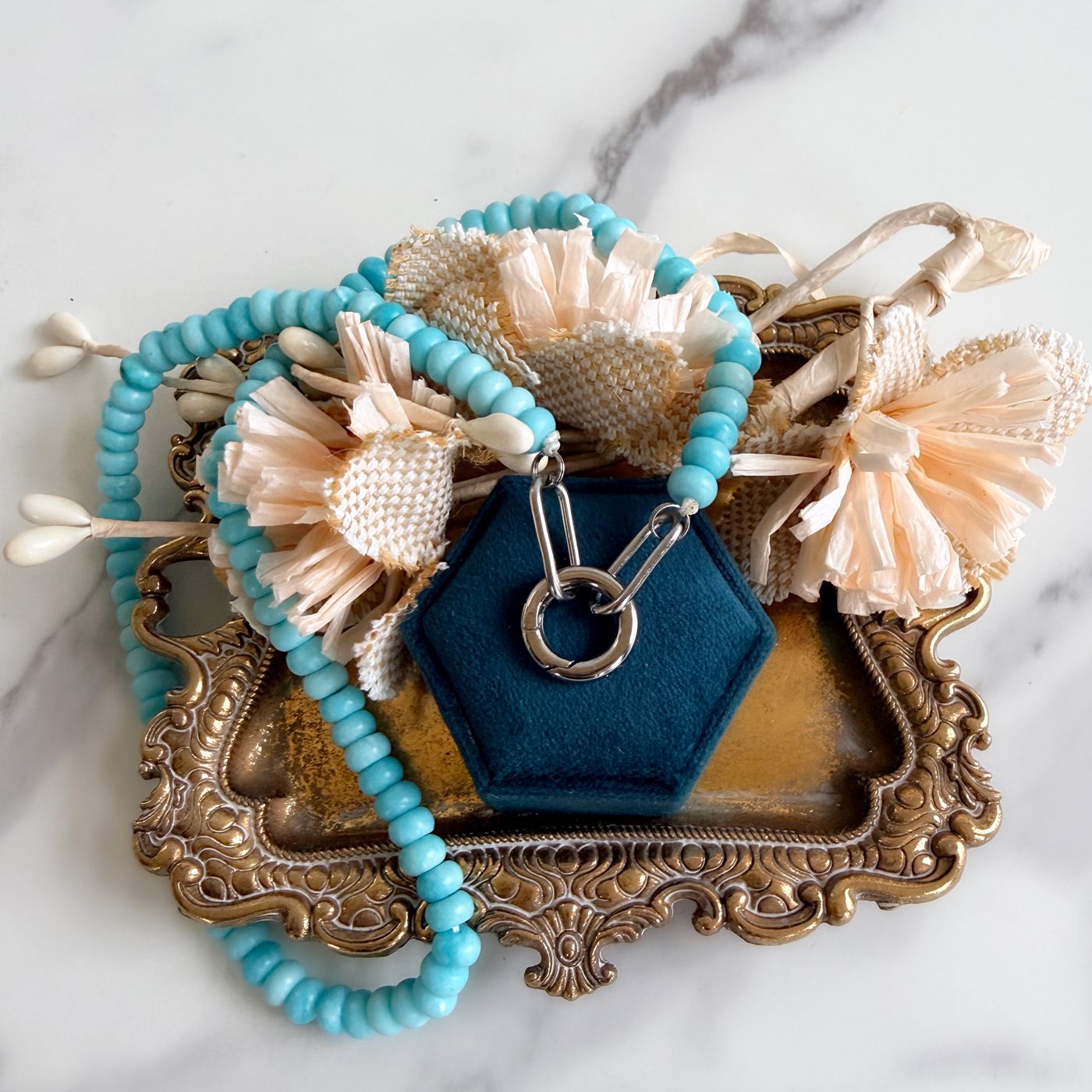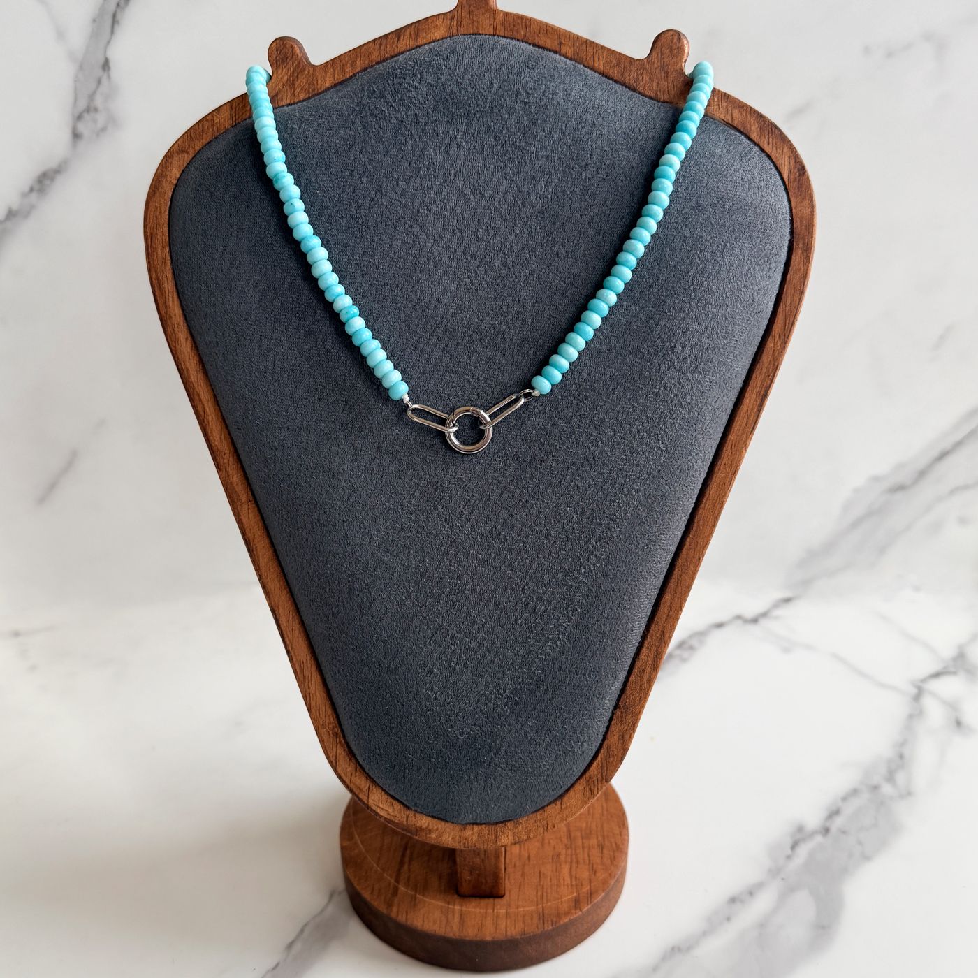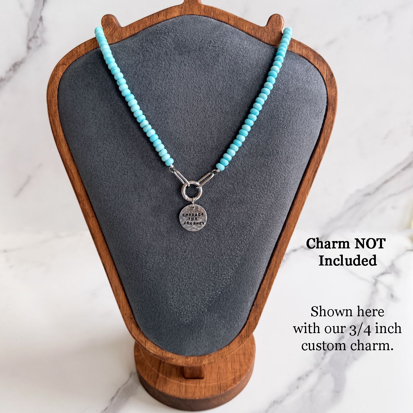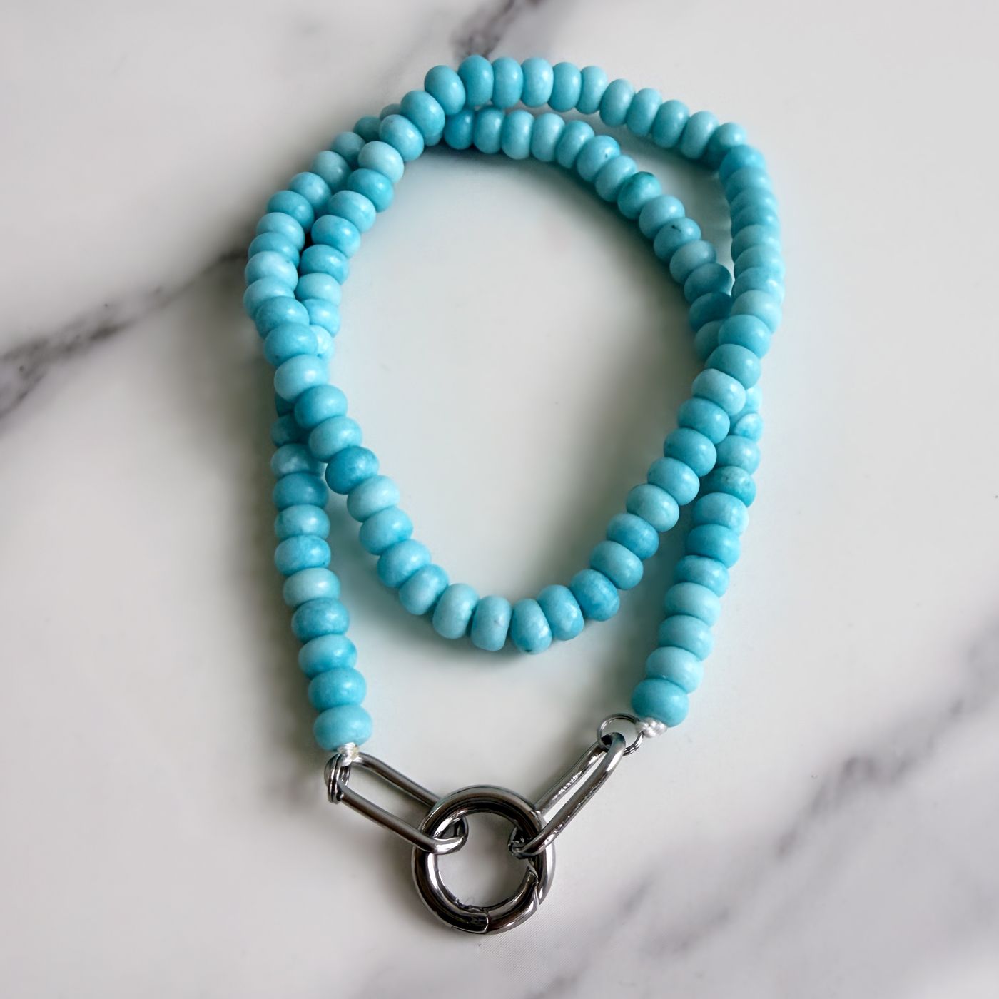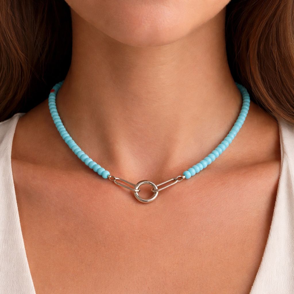 Add a fresh pop of color to your jewelry collection with this vibrant turquoise glass bead necklace. Designed with smooth, rounded glass beads and finished with a bold stainless steel clasp, this piece blends playful color with modern hardware.At the front, a sturdy stainless steel charm holder creates the perfect place to attach your favorite charms, pendants, or keepsakes. Whether you add a meaningful charm, layer it with other pieces, or wear it on its own, this necklace is versatile and easy to personalize.