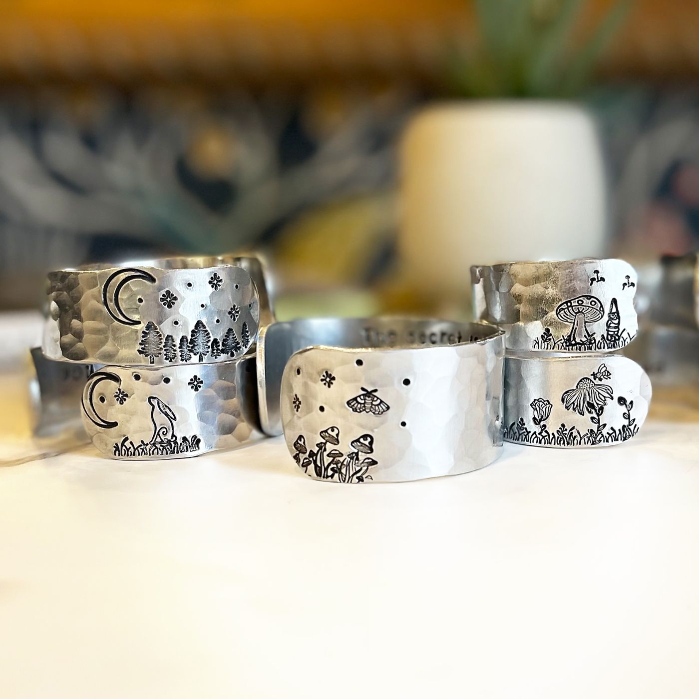 This Rabbit night sky scene spans the entire length of the cuff. The design is hand stamped. Each image is added one at a time using individual stamping tools and a hammer.